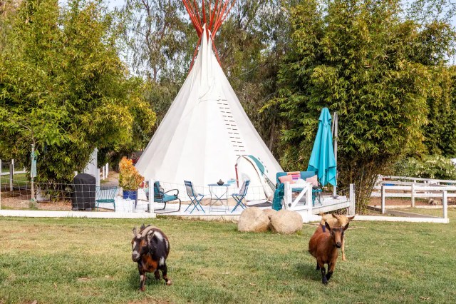 Enjoy a night on the farm inside your very own tipi at this Temecula-area farm stay where the animals are the real stars of the show. You’ll sleep on comfy floor mattresses inside an authentic teepee surrounded by farm animals, including a whole herd of goats (Pssst: Two new babies were just born in May!), chickens, miniature horses, pigs, and one lama. The tipi has a bathroom, hot shower, propane fire pit (the tent is ventilated enough so that it’s safe—we asked!), fridge, mini kitchen, Wifi, 2 twin beds, and a queen bed. When you’re not hanging in the tipi, your fam is free to roam the fruit orchards; pet, brush, or feed the animals; and play on the tree swing. You can even help milk the goats if that’s your thing.