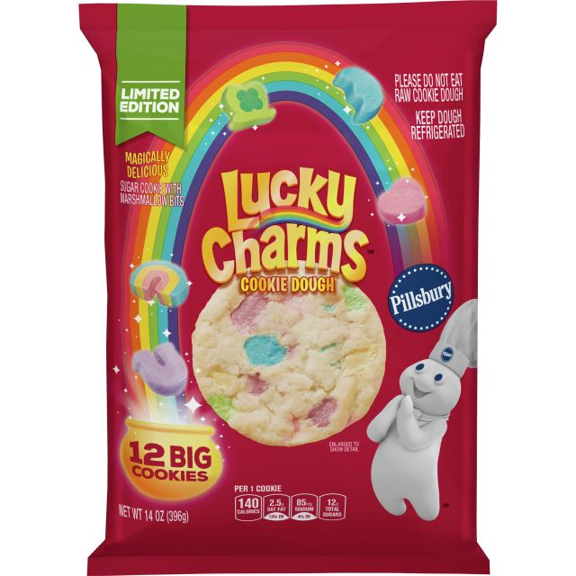 Pillsbury just launched new Lucky Charms ready-to-bake cookie dough. The break-apart cookies are filled with the very same marshmallow shapes you’ll find in Lucky Charms cereal including a red heart, blue moon, green four-leaf hat, rainbow and purple horseshoe.