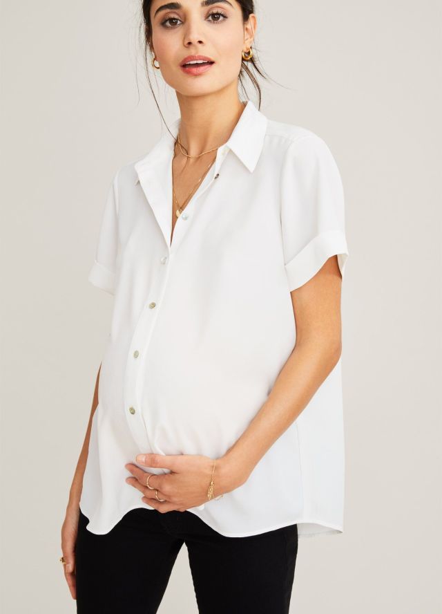 Hatch is a go-to brand for classic maternity pieces and for clothing that transitions well throughout pregnancy, meaning you can wear it when you’re at two months or nine months and about to burst (or even post-pregnancy). This retro-inspired short-sleeve top has an easy access button-down front (all the better to nurse in). Polished enough to wear on zoom calls with the execs but also dresses down real easy for weekend errands.