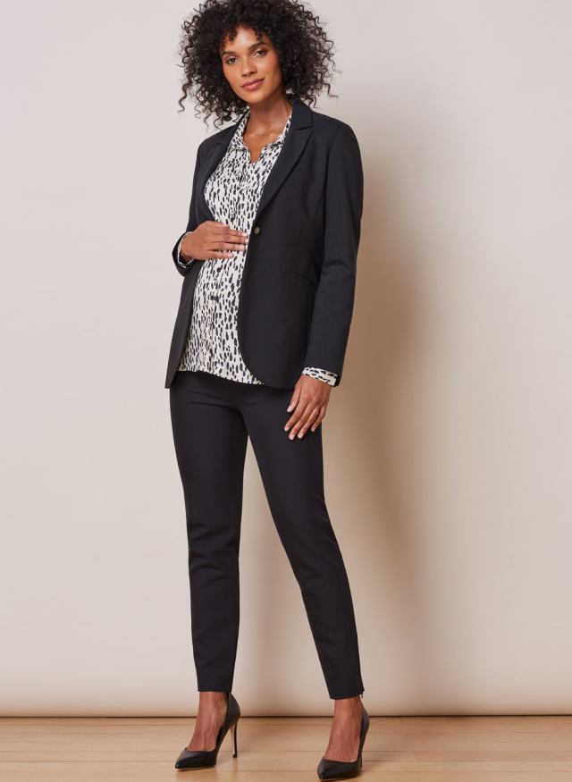 Everything you need to look pulled together and professional from the waist up, even when you're wearing your favorite joggers and cozy slippers off-screen. This chic blazer will be an indispensable part of your maternity wardrobe. We love the single-breasted fit that buttons up above your bump and flatters your figure. Tailored maternity style has never been so easy.