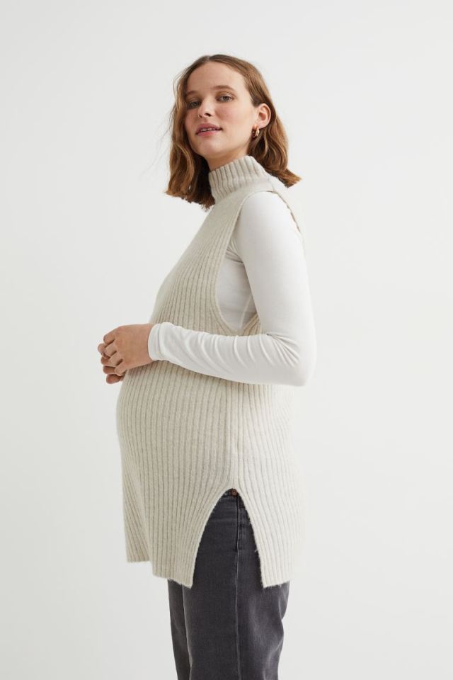 Don't overlook what to wear to the Monday morning strategy meeting. This turtleneck sweater vest in soft, rib-knit fabric is cool and professional. A slit at the sides of them hem makes means it will continue to fit as your bump grows.