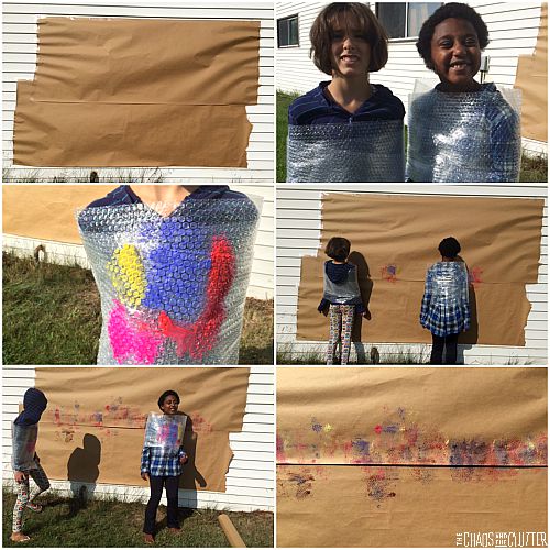Kids will love becoming a human roller stamp with this whole-body activity courtesy of The Chaos and the Clutter. Just dip your crazy kiddos' bubble-wrapped bodies in paint and let them slam against or roll around on their canvas of choice. Will they make a masterpiece? Who cares! Note:If you'd like to keep your human bubble wrapping on a smaller scale, try this bubble wrap stomp painting project from Mess for Less.