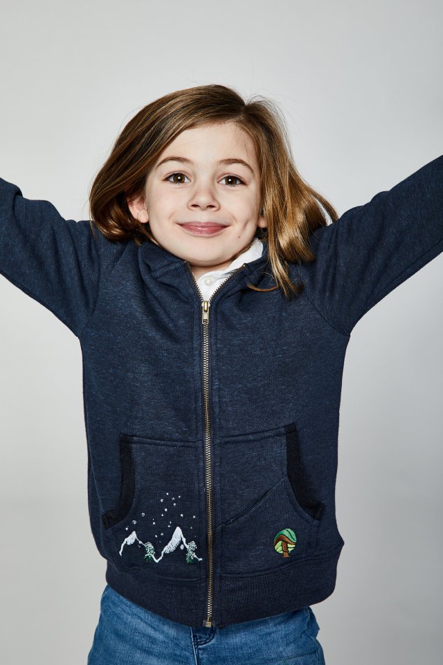 TreeHouse Design Studio aims to encourage kids’ creations. Their newest design—called “REESEscape” named for artist, Reese Fox—is translated onto a heather navy hoodie with a combo of screen printing and embroidery. The original piece used a combo of permanent markers and watercolors. Each hoodie is produced in downtown LA and includes an oversized name tag so kids can personalize their hoodies.
