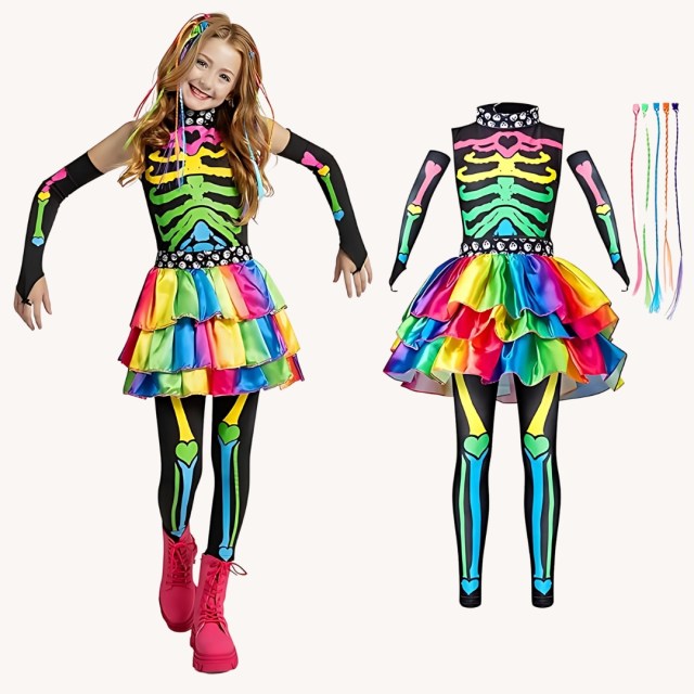 This isn’t your average skeleton—it’s a glow-up from the grave. With bright colors and a punky twist, this costume is basically a Halloween rave in bone form. Classic spooky with extra flair? Yes please.