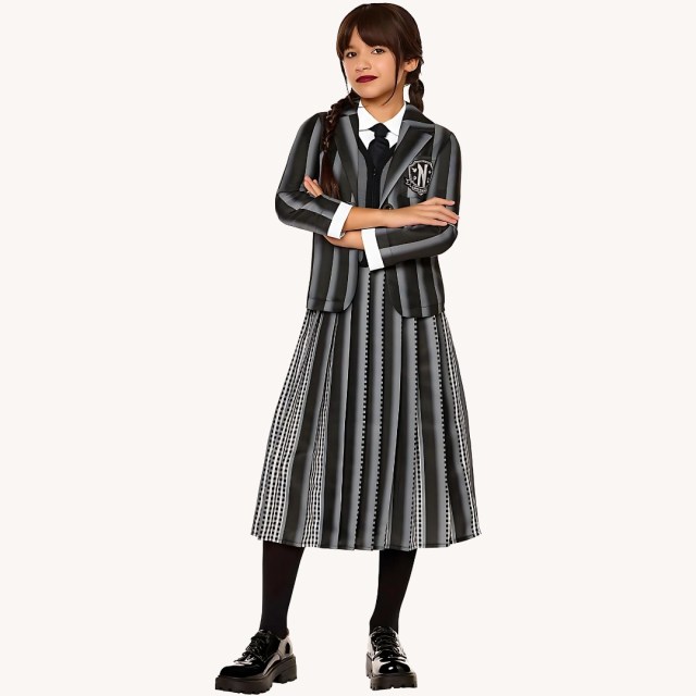 The Nevermore uniform nails Wednesday’s signature deadpan energy: zero sparkle, maximum sarcasm, and "I don't do cheerful". Trick-or-treating, but make it moody.