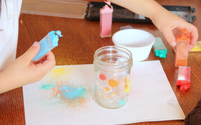 Decorate a candleholder with the help of those tiny little piggies. All you need are a few dabs of glue and some rainbow craft sand to cover a mason jar with adorable finger or toe prints. Check out some of the photos of the finished, illuminated project at Sugar Aunts.