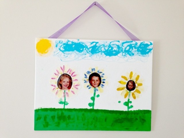 This flower family picture from Domestic Mommyhood showcases cute faces surrounded by real flower petals for a natural touch. Tiny fingerprints make for perfect leaves on the stems. This craft is also great for babies with older siblings and is sure to brighten mom's day.