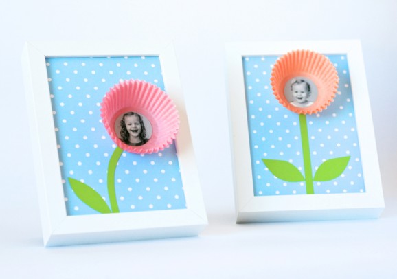A cupcake liner adds a 3D effect to these framed smile blossoms, and all your little one needs to add is the beautiful smile for the photo. Visit the Paging Supermom blog for the tutorial and a free printable of the blue polka-dotted background.