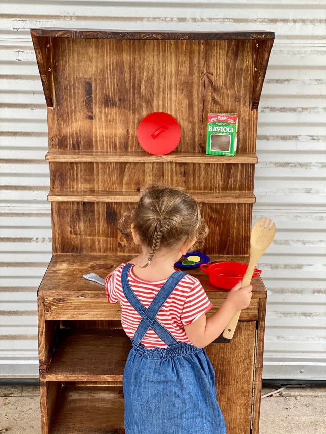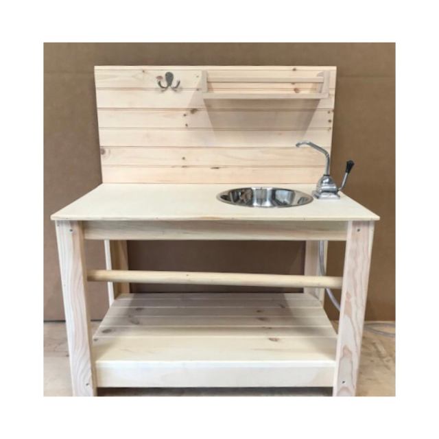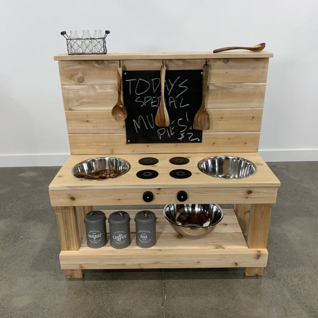 Double shelves with a dark finish make this mud kitchen a classic you’ll love for years.