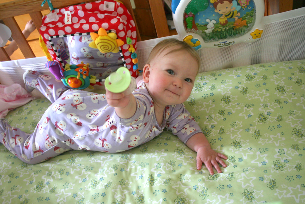 Have the tools for happy naps at the ready. Keep baby’s pacifier, sleep sack and sound machine at hand so that if she happens to fall asleep in her chair, it’s easy to transfer her to her crib. Doing this will help cement the fact that when their heads hit the crib mattress, it’s time to doze.