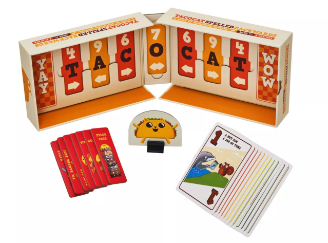 This easy-to-transport game is great for quick two-player fun. The box doubles as the game board, where a cat (who is also a taco) is on the line in a match of strategy and instinct. Everyone is in for some fun when playing with the silly illustrated palindrome cards and tiles!