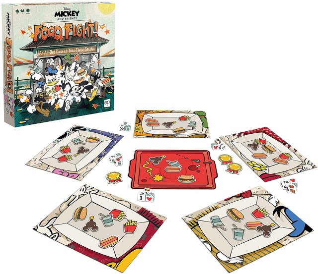 In honor of Disney World’s 50th Anniversary comes a fun new game featuring Mickey and his crew. In a fast-paced dice game, players roll and toss food to the other players’ trays. Be the first one to empty your tray to win!