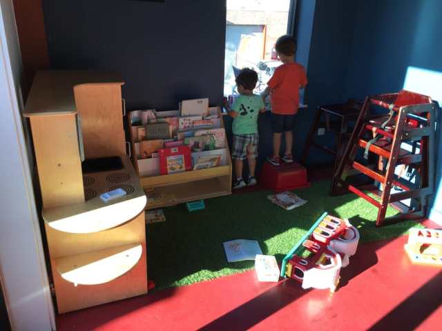 Looking for some extra mommy points? Meet up in an ice cream shop!  The popular Ample Hills Creamery in Brooklyn's Gowanus is an ice cream shop that also houses a small kids area. One of the largest Ample Hills locations, the shop has two floors and a kids area with  a play kitchen and some books to keep the kids entertained. With three large booths and counter seating, this is a great place to hang with other parents and in the summer, you can head to the roof deck to enjoy the views while you sip your milkshake.