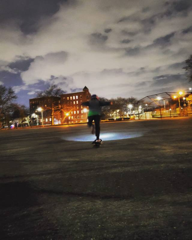 "Going outside when nobody is outside—like a vampire—on his beloved skateboard, painting rocks, going on scooters in the park and finding the place where are people are away and playing frisbee."