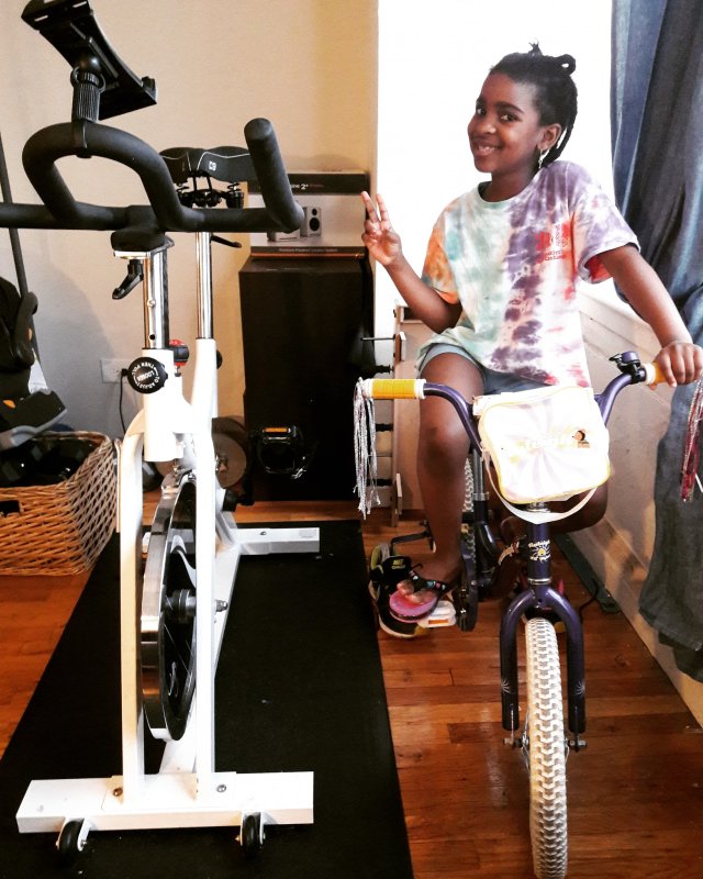 Note from Billie's mom: "We set up her bike as a stationary bike [by] putting the training wheels in a pair of my husband's big sneakers, based on a viral Facebook post. We just started doing Peloton classes together or sometimes she'll get on her tablet and ride."