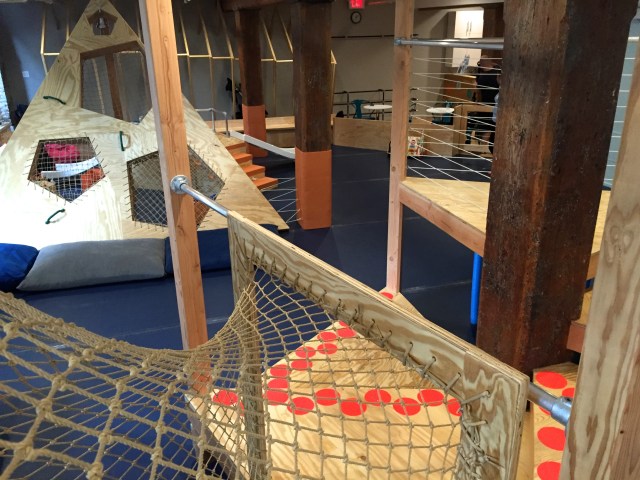 Additional fun touches include colorful ship wheels for turning, binoculars and telescopes for spying and two small “walls” made from foam noodles at the base of one structure that are great for crawling through. A separate cubby area with two levels features a ladder and netting for getting in and out, as well as walls painted with bright blue magnetic paint and magnets for decorating. The larger play space also features a giant triangular structure outfitted with handles and netting and a bell to ring when you’ve reached the top! (Sort of rock climbing ultra-lite.)