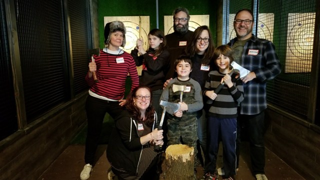 If you and the family want to drop by for some axe-throwing fun, it’s $35 per person plus tax. Book online in advance. if you want a private range, request one, but you may end up playing with strangers depending on how busy things are. (Either way you’ll have fun.)