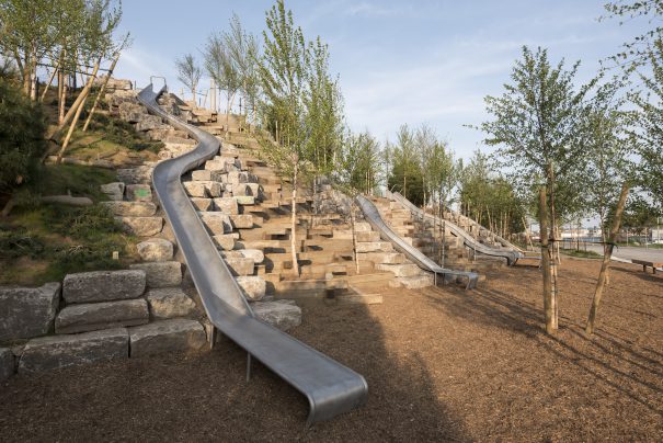 Discovery Hill rises up higher, at 40 feet tall. The wood shavings here make for soft padding underfoot, but they do tend to get into sandals. Wear sneakers for this one! The climb is fairly steep, and a small fence looks to be more to keep people out of the newly-planted brush than for safety, so hold extra adventurous tykes close. This hill is home to “Cabin”, a permanent art installation by Turner Prize-winning British artist Rachel Whiteread, and provides some great views at the summit.