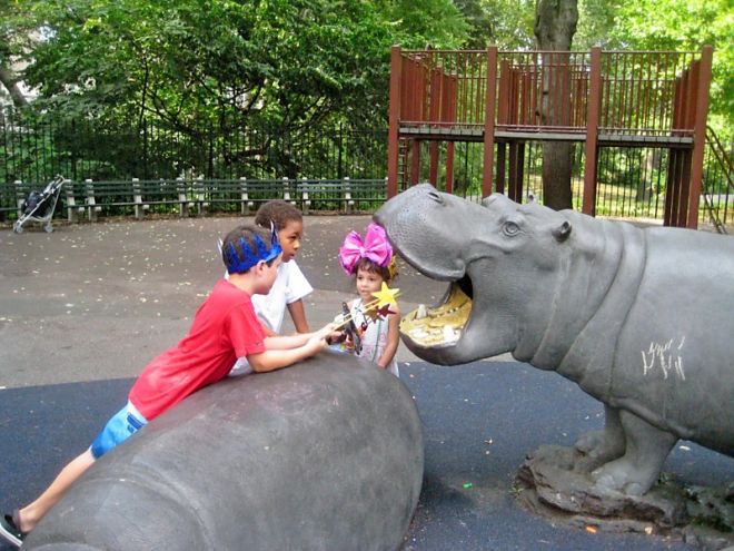 Burn off energy at a favorite playground. You’ll also find dozens of playgrounds on the Upper West Side including the oldest one in Center Park, Heckscher – nearly redone for your pleasure (if it was good enough for Peter Thatcher in Tales of a 4th Grade Nothing it’s good enough for your SuperFudge) and Hippo Park along Riverside Drive, which not only has hippos, sprinklers, swings and monkey bars, but also a cool little playhouse that you can rent for birthday parties. Just don’t confuse it with Central Park’s Safari Playground, which also has hippos. (Many a birthday bash has been tragically derailed by clueless parents going to the wrong spot.)