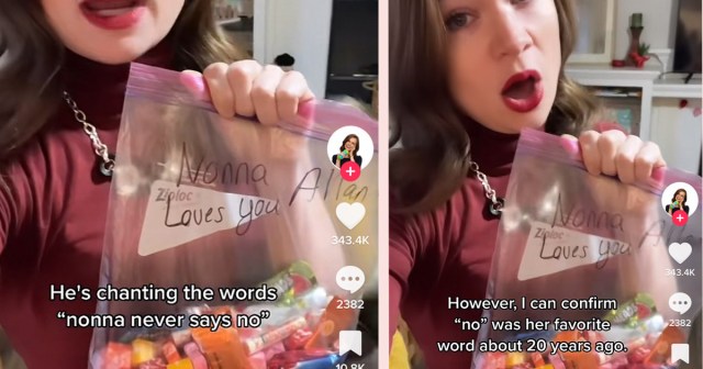 While every working parent knows how grateful you can be for a grandparent who’s always willing to babysit, Sullivan’s video perfectly captures the chaos that so often comes later, when a toddler returns home with a new outfit or a pile of new toys—or, in this case, a gallon bag full of treats with “Nonna loves you” scribbled across the front in Sharpie.