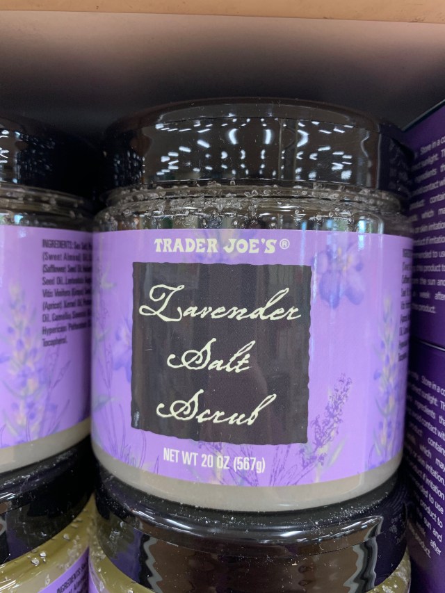 Detox from a long day with Trader Joe's Lavender Salt Scrub that is made with almond, apricot and avocado oils. The 20 oz. jar holds the delicious-smelling salt-based formula that gets rid of dry and dead skin and is nice on the wallet at only $5.99.