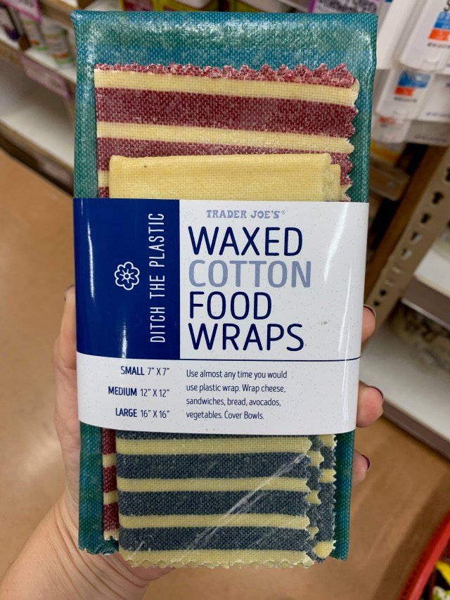 Trader Joe's Waxed Cotton Food Wraps are the alternative to plastic wrap you've been looking for. The 3-pack of clothes comes in three sizes, are made in Tunisia and are 100 percent cotton infused with beeswax, jojoba oil, and pine resin. Use anytime you would normally use your single-use plastic wrap and enjoy this reusable product for just $8.99.