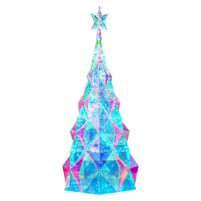 An out-of-this-world holiday vibe awaits with this multi-colored panel-sided Christmas tree!