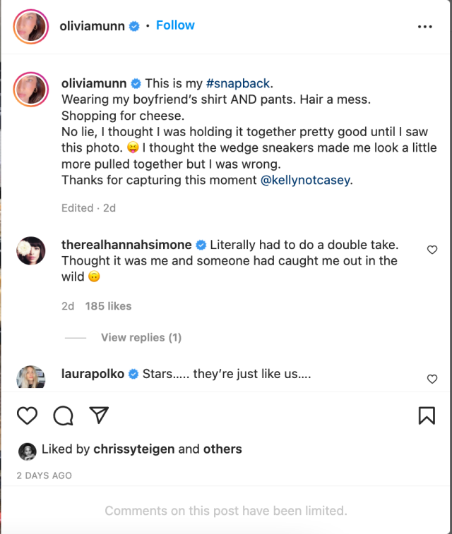 In a recent Instagram post, the new mom to Malcom and partner to John Mulaney shared a photo of her out and about, perusing the cheese section at Whole Foods (where else would you shop for cheese?). Munn jokes about her appearance as she sports John’s clothes.