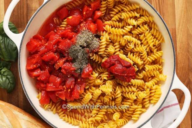Are you trying to figure out what to do with leftover cooked chicken? This easy dinner from Spend with Pennies is the perfect leftover meal. Chop up your cooked chicken and throw it in with the rest of the ingredients for an herby tomato pasta skillet ideal for busy evenings.