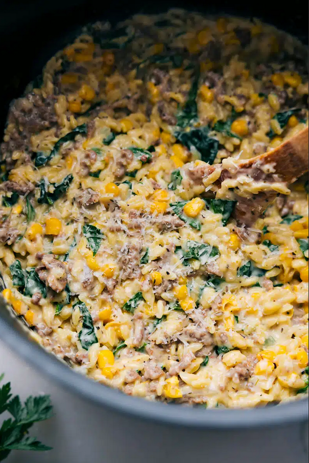 Orzo is an often-overlooked pasta, but we love it for its fun rice-like shape. This recipe by Chelsea’s Messy Apron pays homage to the humble orzo with sausage, corn, fresh spinach, Italian sausage, and parmesan for a hearty, creamy meal that resembles traditional risotto.