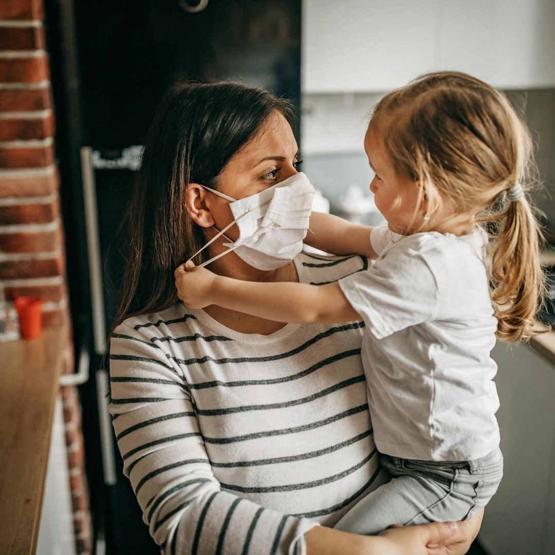 First, offer your child a simple explanation for why people wear masks. For example, “A mask is something people wear that covers their nose and mouth. Wearing a mask helps keep people from getting sick.” Let your child touch and hold your mask before you put it on. Children learn through play, so include masks in silly “peek-a-boo” games or in pretend play. Make little paper masks for your child’s stuffed animals or dolls. Allow your child to pick out or decorate their own masks and let them practice putting them on and taking them off all by themselves.