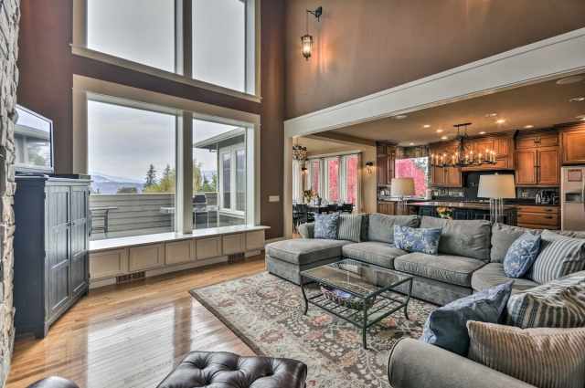Only a short hour drive from Bend, this rental house offers families breathtaking views of Mt Adams. This 7-bedroom, 5.5-bath home features a two-story great room, gourmet kitchen, and deck overlooking the Columbia River Gorge. You'll find the true luxury amenities downstairs, include a game room, wet bar, terrace and theater room with stadium seating for the whole family! You may just want to move in before your stay is over.