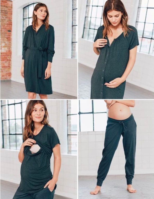 A super-soft, easy-fit pajama top with lift up nursing access, a comfy over bump pajama bottoms with a tapered leg, a maternity and nursing nightie with snaps at the front for easy nursing and skin-to-skin snuggles, and a cozy matching robe to keep you warm, covered up when you want to be, and excellent for busy hospitals or at home when you have visitors.