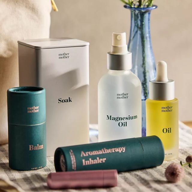 This bundle includes five soothing treatments made with clean ingredients: magnesium oil, magnesium soak, body oil, balm, and an aromatherapy inhaler, all tucked into a cute pouch.