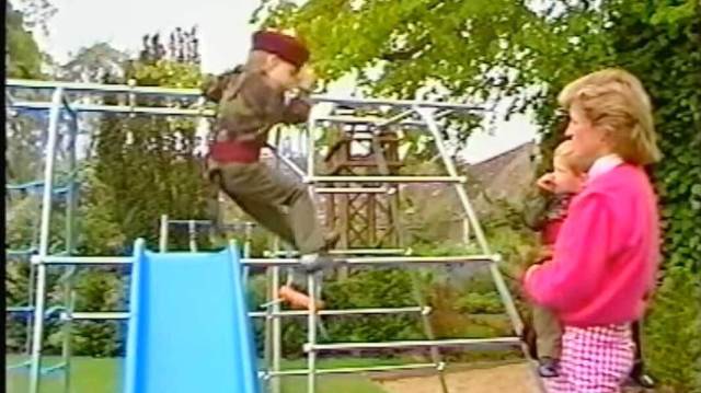 Princess Di, meanwhile, is the mom you’d want to chat with on the playground. She’s not a helicopter mom; she only comes to the “rescue” when William is clearly stuck and asks for help. She lets him climb all over the steel structure while holding Harry on her hip, jumping to catch him (though she probably would have failed if he hadn’t gotten a grip as he slipped) when he loses his footing, then cutting him an epic mom stare (paired with a grin) afterward.