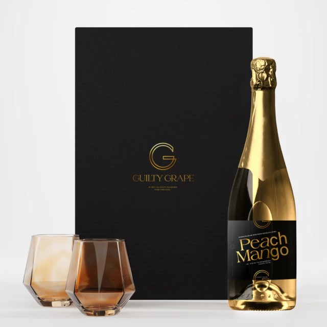 The foundation of The Guilty Grape is inclusivity, celebration, and luxury. The TGG crew says this Peach Mango Sparkling wine tastes of crisp citrus, ripe sweet mango, and freshly picked peaches. Add the stunning amber wine glasses and you have a party for two!