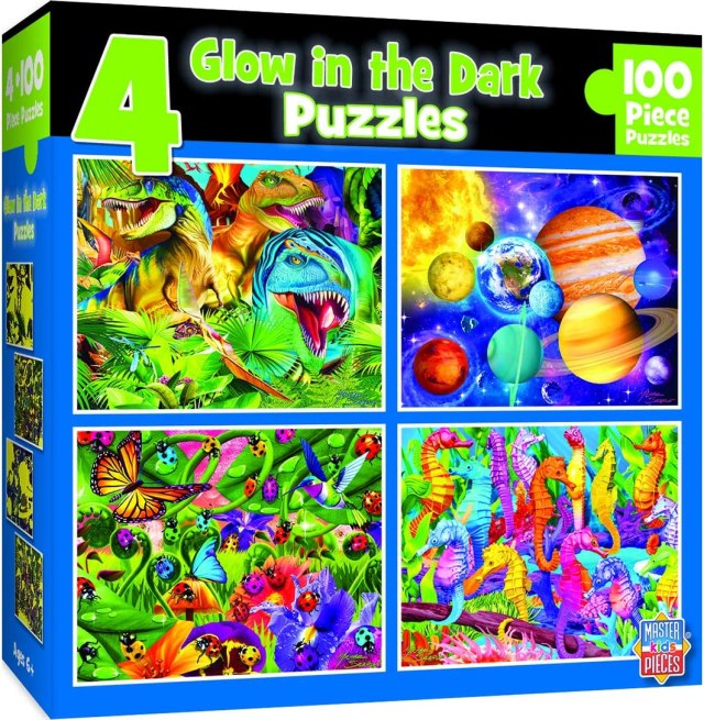 This four-pack of glow in the dark puzzles has a dino scene, a solar system scene, an outdoor scene and a seahorse scene. Fun for sleepovers or for kids who need to stay in bed at night!