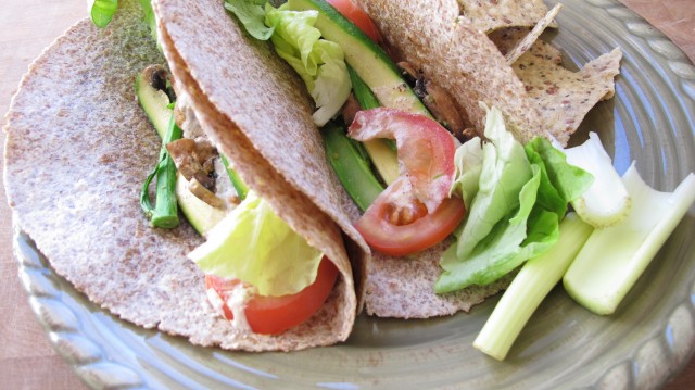 2. Put veggies into tortillas and drizzle sauce over the top. Enjoy with a side of celery and sprouted grain tortilla chips!