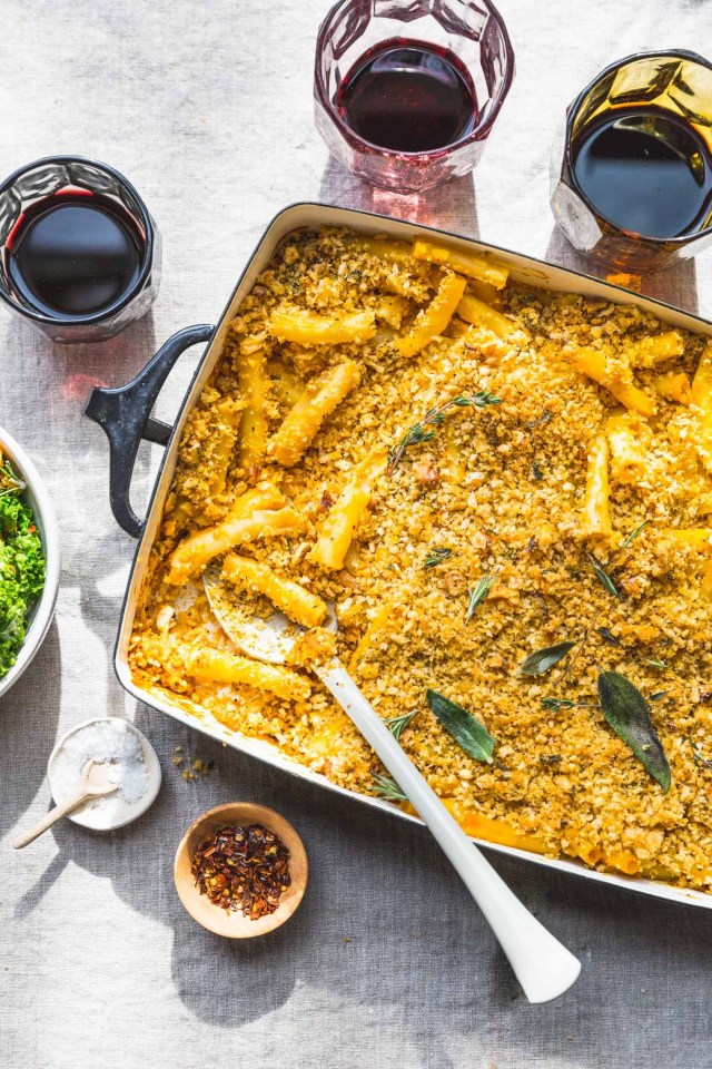 This recipe from Vegan Richa is bound to be a hit with your whole crew. Blended cashews give the dish its creaminess, while a toasted breadcrumb topping adds crunch. To get the recipe, click here.
