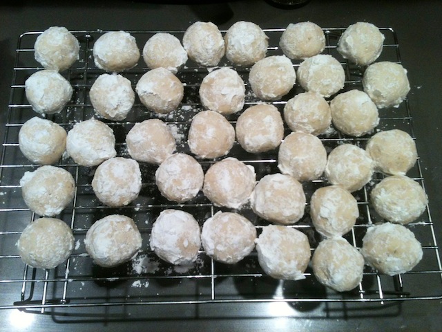 5. Roll warm cookies in powdered sugar; cool on wire rack. Roll in powdered sugar again.