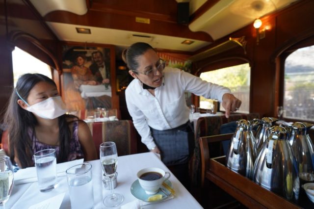 Stepping into the train car truly feels like time travel with rich mahogany panels coupled with tasteful brass accents engulfing the car. A champagne (or cider) toast sets the right tone and as the train pulls away, attentive staff offer four types of tea: Yunan black, earl grey, chamomile and rooibos.