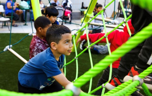 Looking for a place to work out while the kids go down the slide 50 times? This playground not only includes play areas geared toward toddlers as well as the five and up crowd, it has outdoor fitness equipment for adults. There’s also a massive clubhouse, a stage and community garden plots. Fun fact: the clubhouse features recycled denim insulation!