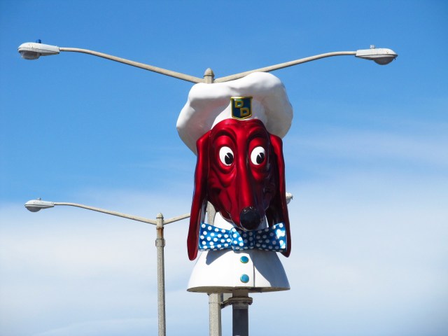 The hot dog and hamburger chain closed in 1986, but this seven-foot-tall fiberglass grinning dachshund mascot was moved to Sloat Avenue and now it’s a city landmark.