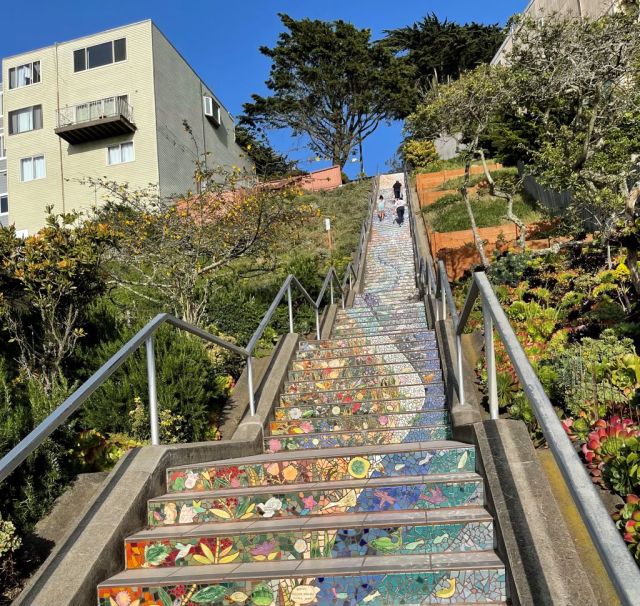 Enter the stair section of the adventure. The nice thing about stairs is that they lead to elevation and elevation leads to heighted views! While walking down the 163-step staircase that boasts sweeping sights of Golden Gate Heights’ Grandview Park, don’t forget to look back at the colorful mosaic of art. Fun Fact: The 16th Avenue Tiled Steps project started in 2003 as a way to connect the community through a project to beautify the neighborhood. Nothing like a history lesson along the way.