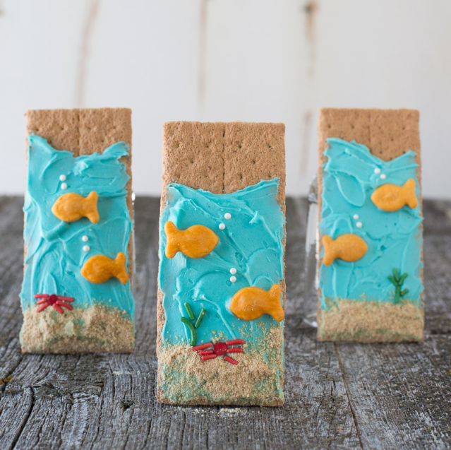Festive and oh-so-easy, these under the sea graham crackers pair every kiddos fave snacks! Pantry staples like graham crackers, goldfish and sprinkles combine with blue frosting to make a fun underwater scene that can be as simple or as detailed as you want. Get all the details at The First Year.