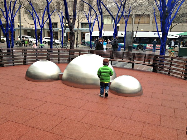 Westlake Park Playground gets major mom-points (they exist, it’s true) for having that awesome, squishy surface to protect our kids from falls, for having a fence that goes nearly all the way around the play area, and for the benches that are perfect for putting our tired mom kicks up while our kids play. Moms of kids who love to climb, keep an eye on the metal domes — they can get quite slippery after it rains… which happens every now and again in Seattle! Wink, wink!