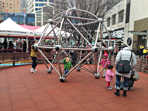 Whether you’re already downtown running errands, need somewhere to let your kiddos run wild before dragging them to yet another round of shopping, or if you’re simply looking for a new place to explore, the newly opened Westlake Park Playground is the place to go! Hitting the Seattle playground scene in early March 2013, Westlake Park Playground is small, but interesting, just as a playground in the middle of the hustle and bustle of downtown should be. There are two main pieces to the playground — a fun climbing structure that kids of all ages will adore and a turtle-esque set of metal climbing domes that also double as slides! Go tell your kids that you’re going downtown…to play!
