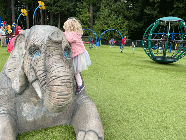 Another playground on the Eastside you won’t want to miss is a playground in the heart of Lake Sammamish State Park. Located right on the shores of Lake Sammamish in Issaquah is where you will find this whimsical, coal mining town-themed playground. You’ll be delighted by an oversized mushroom cottage, hidden woodland creatures, mining town cubbies and cabins, and a painted stream with leaping salmon.