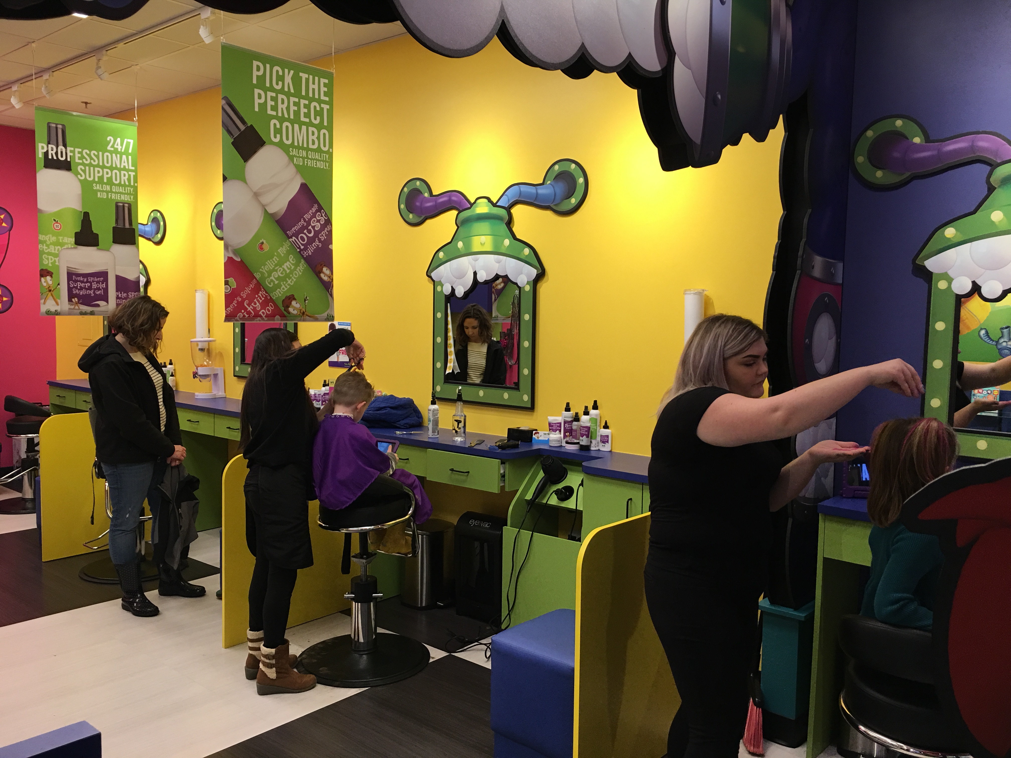 At the beginning of each appointment, haircut recipients receive a key-card-like pass to hold during their service. After their appointment (which can include a haircut, a shampoo & cut, added styling or just a simple bang trim), kids drop their passes into a special slot on a Magic Box to earn a cool prize. Computer tablets are also available during haircuts for pint-sized entertainment and fun accouterments are available as well (think sparkles, washable hair color or hair tinsel which is like a weave that stays in for a considerably long time). Higher-end hair accessories and toys are also available for sale.
