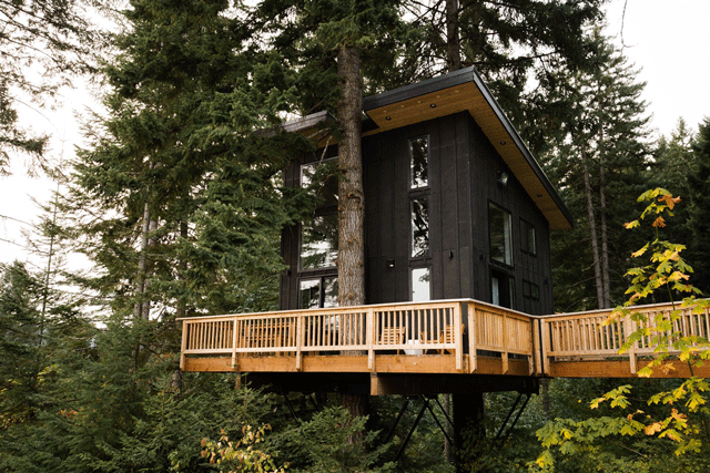 Chic and sleek, this treehouse would win all the TV design awards. This Scandinavian-style  black wood, modern treehouse is fully supported by three Douglas Fir trees. It sits 20 feet above the ground at its highest point and floor-to-ceiling windows and skylights offer picturesque views of the surrounding forest, valley and Mount Adams. Snuggle up with blankets and pillows in the living room during the winter or slide open the glass doors to the view deck during the summer. Every accent, furniture piece and detail are perfectly curated. The Klickitat Treehouse has heating, AC, indoor and outdoor showers, an indoor wood-burning fireplace (total bonus), a kitchen and private fire pit. Don’t forget binoculars for bird watching and board games for hunkering down.